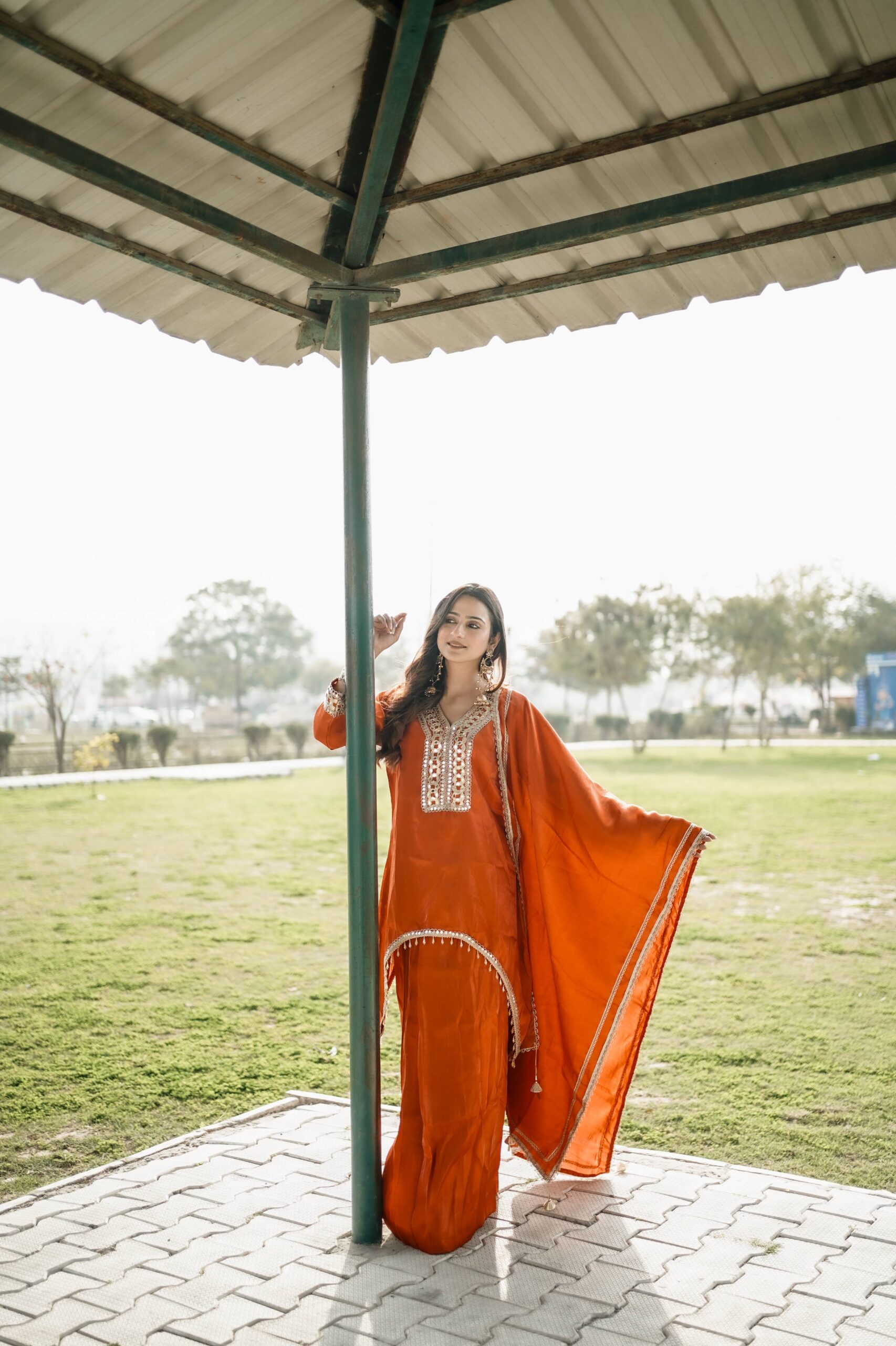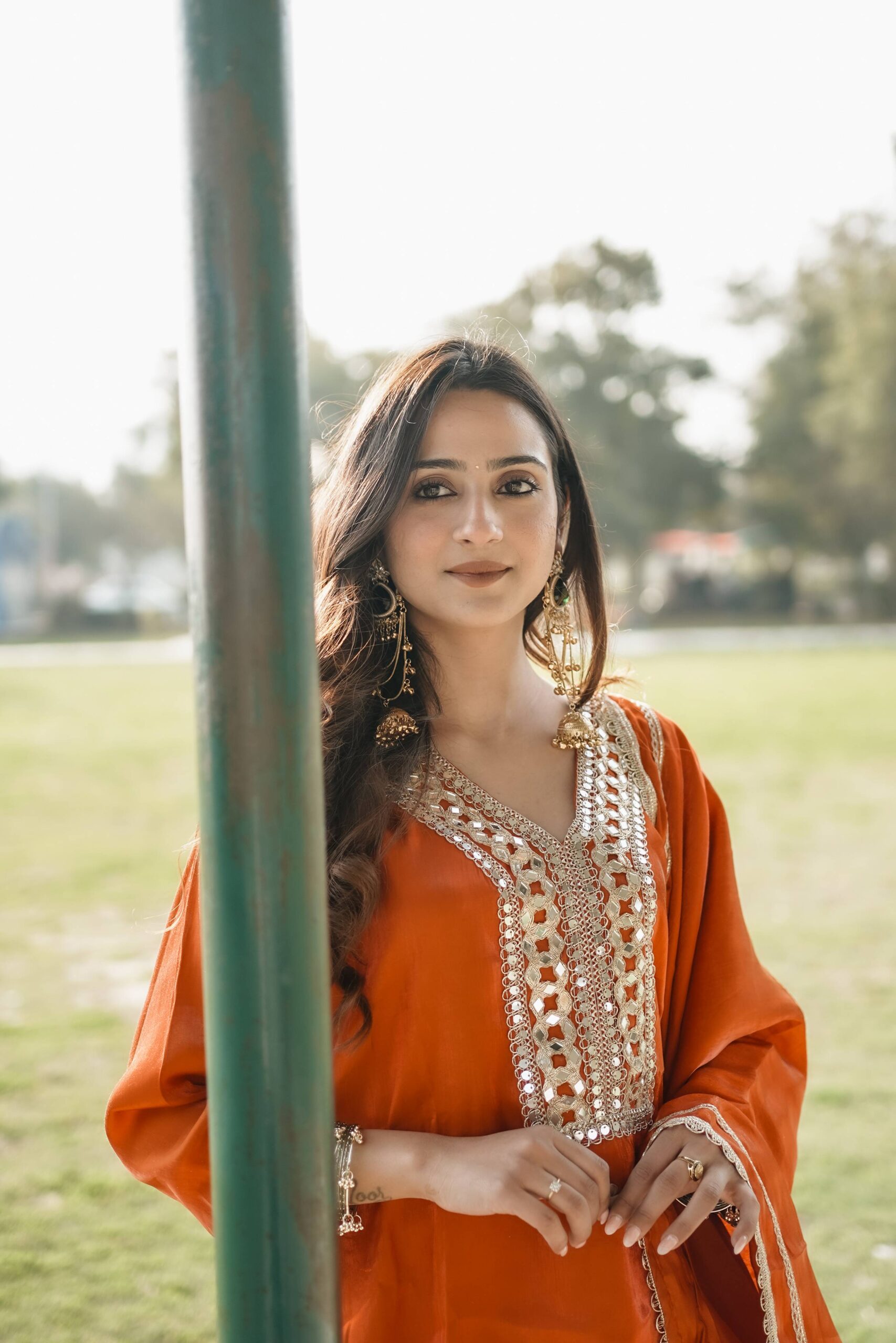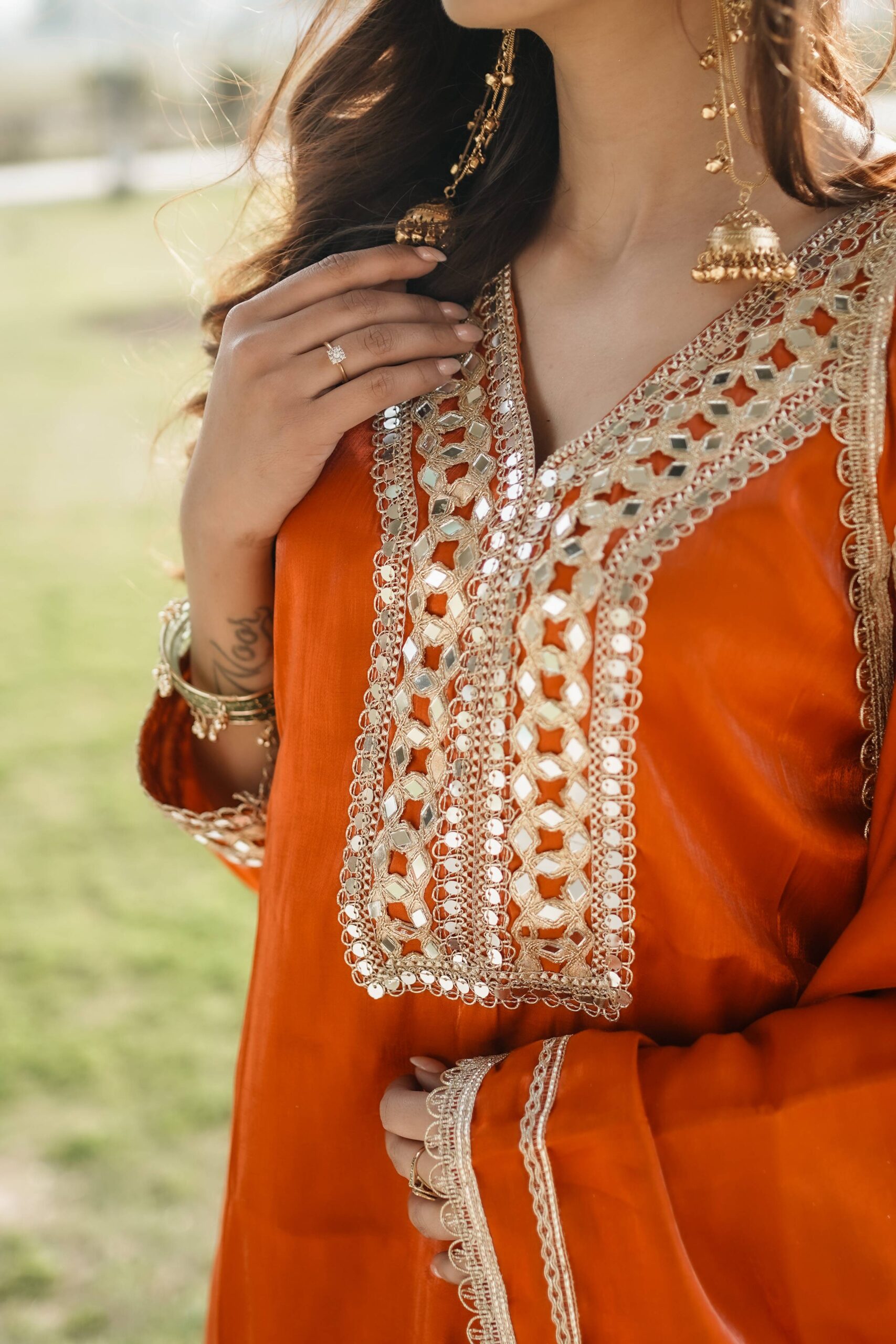 Make a bold festive statement with Noor-e-Zamrud, a striking orange kurta set designed for women who love vibrant elegance. Crafted in a rich, eye-catching hue, this ensemble features intricate mirror work and detailed embroidery along the neckline, sleeves, and hemline — adding depth, shine, and festive charm.