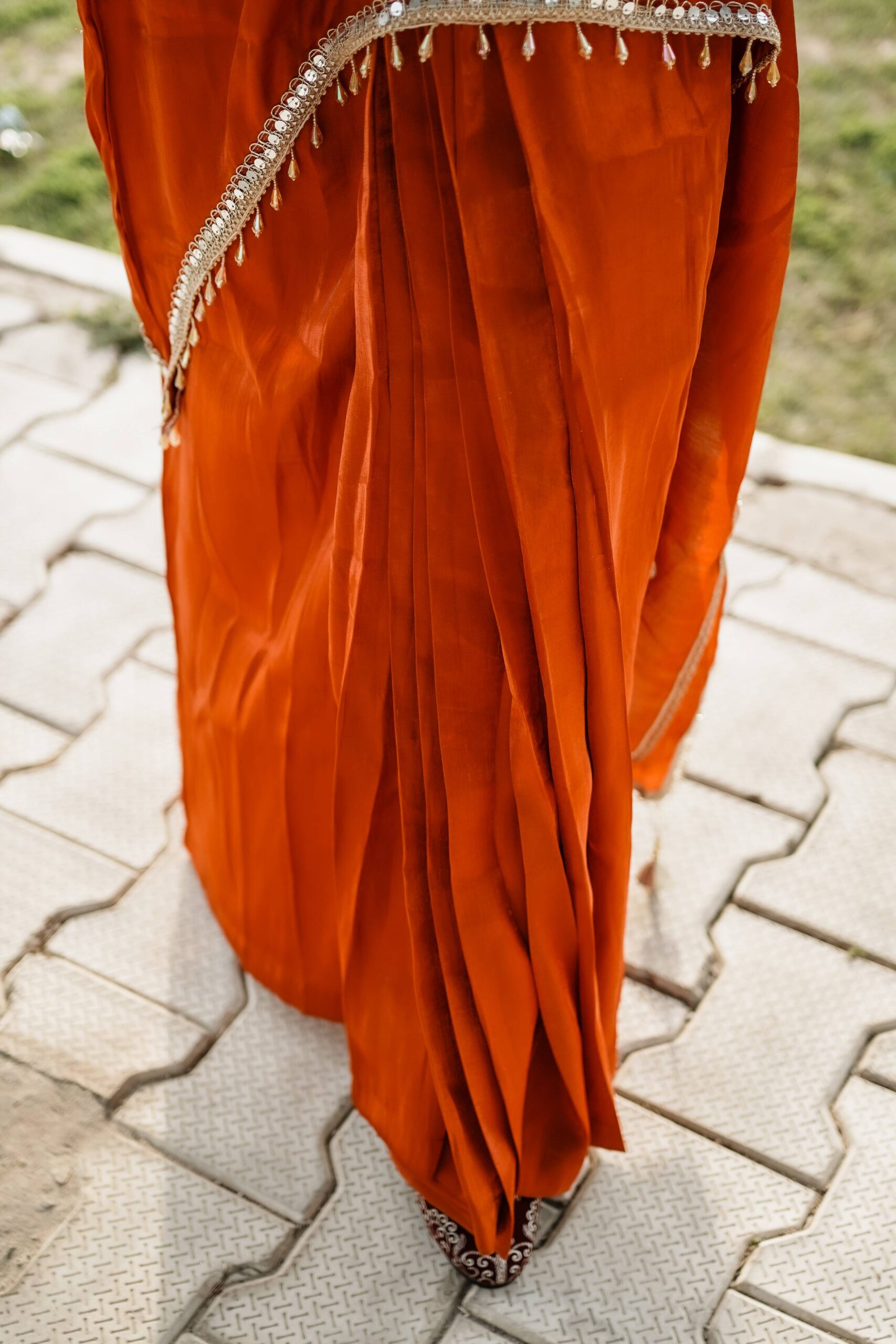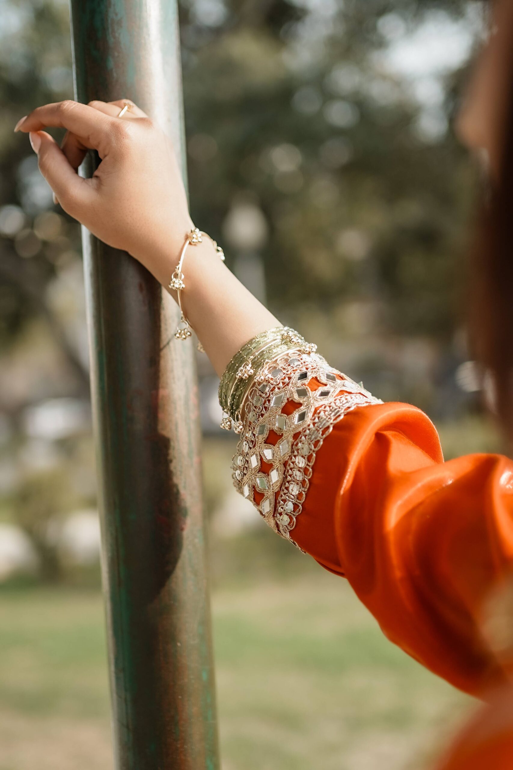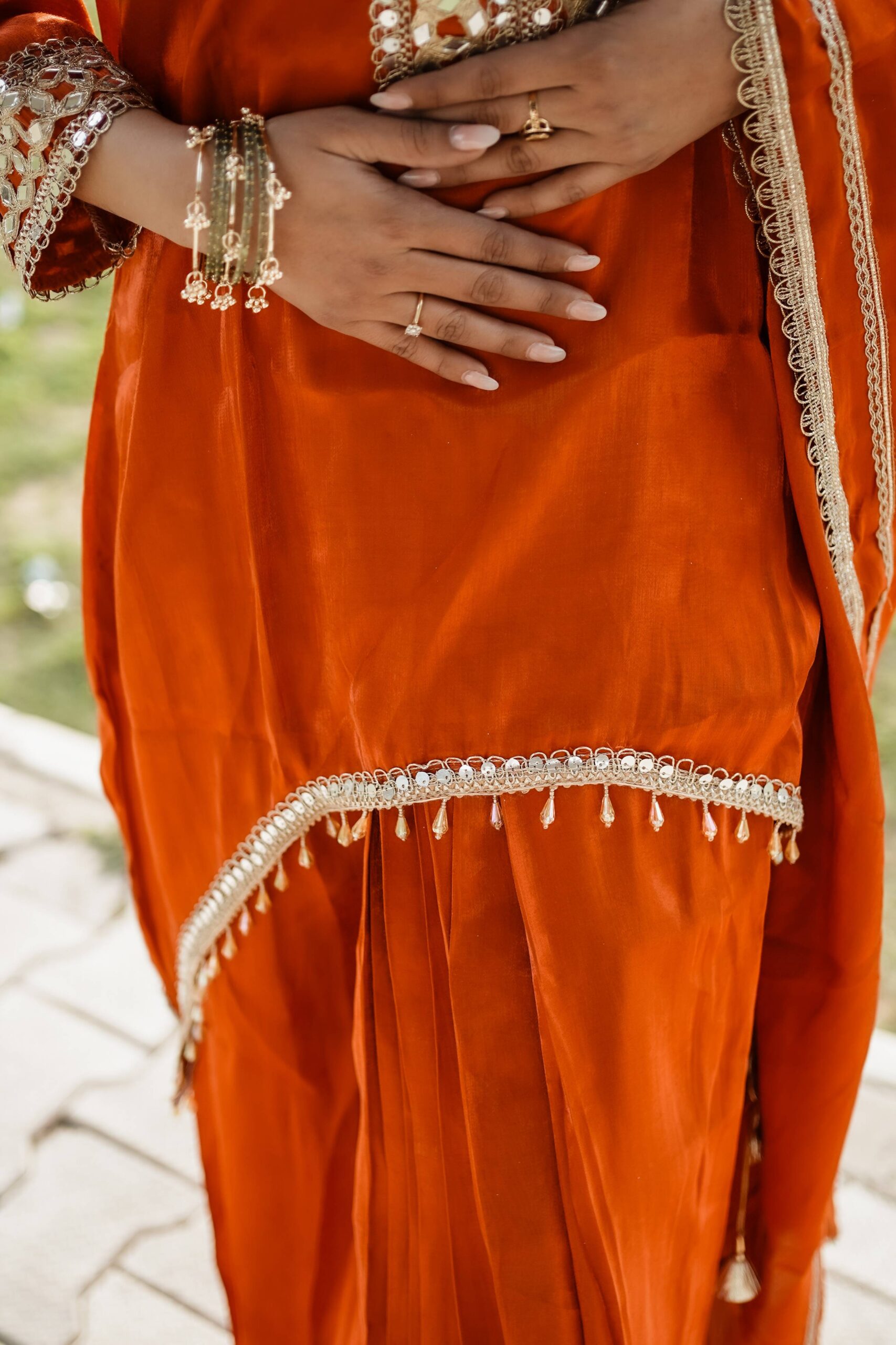 Make a bold festive statement with Noor-e-Zamrud, a striking orange kurta set designed for women who love vibrant elegance. Crafted in a rich, eye-catching hue, this ensemble features intricate mirror work and detailed embroidery along the neckline, sleeves, and hemline — adding depth, shine, and festive charm.