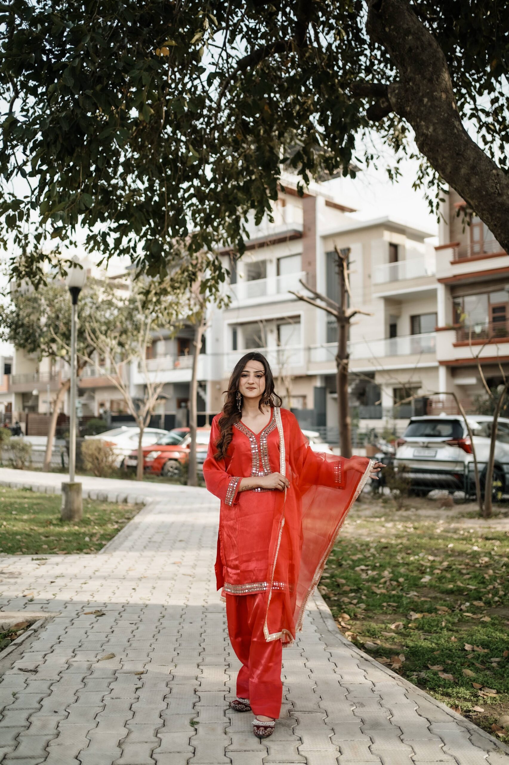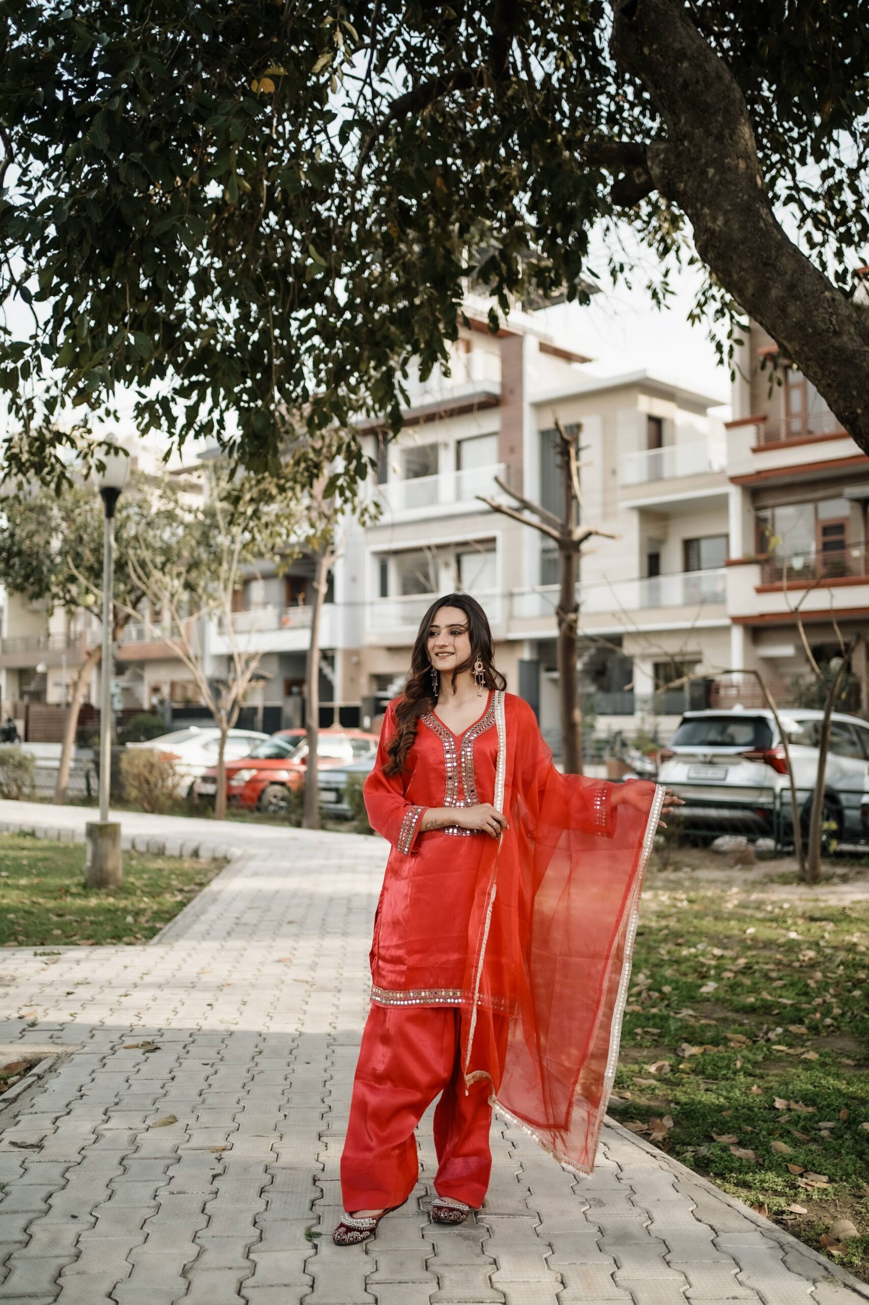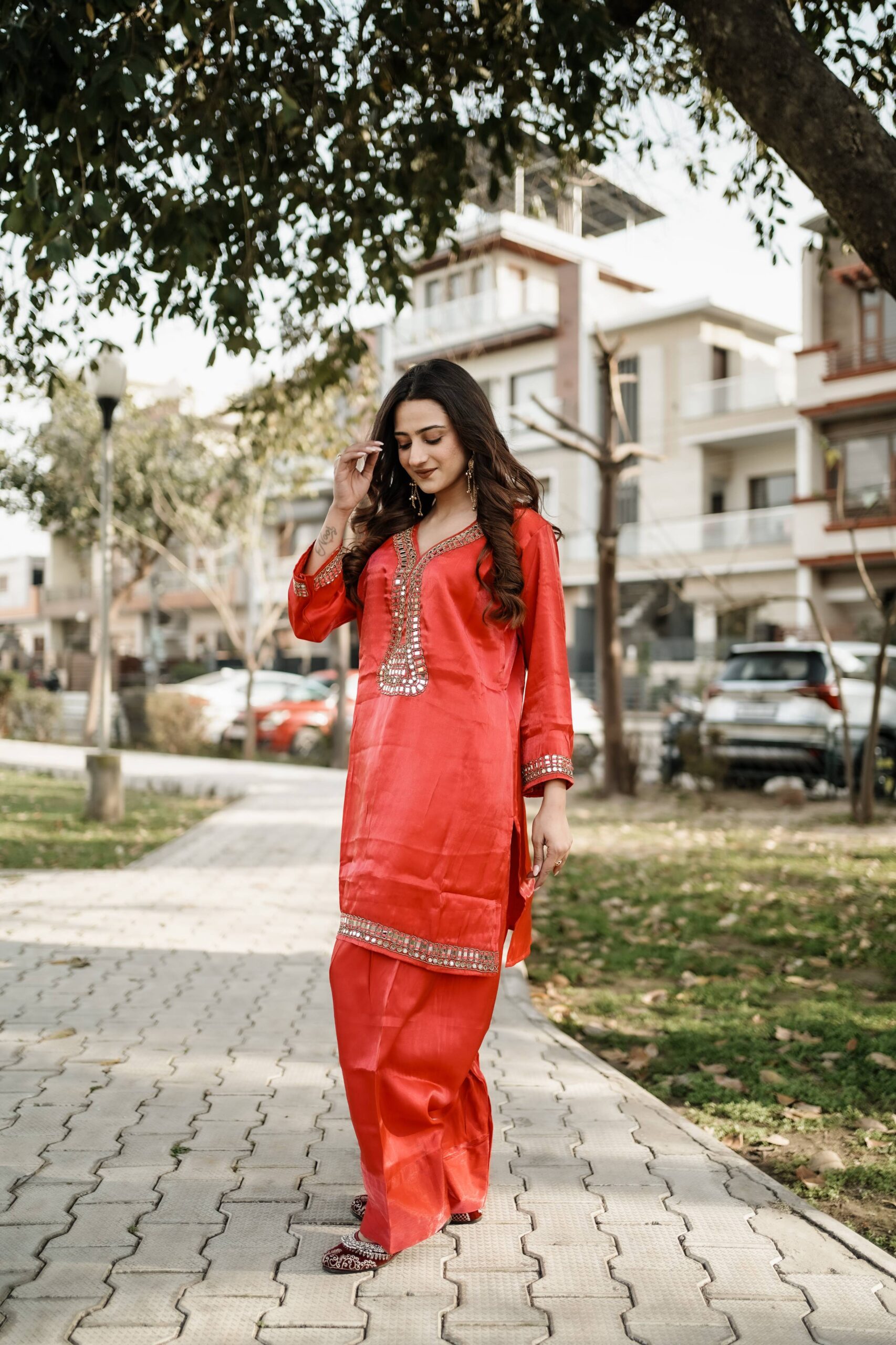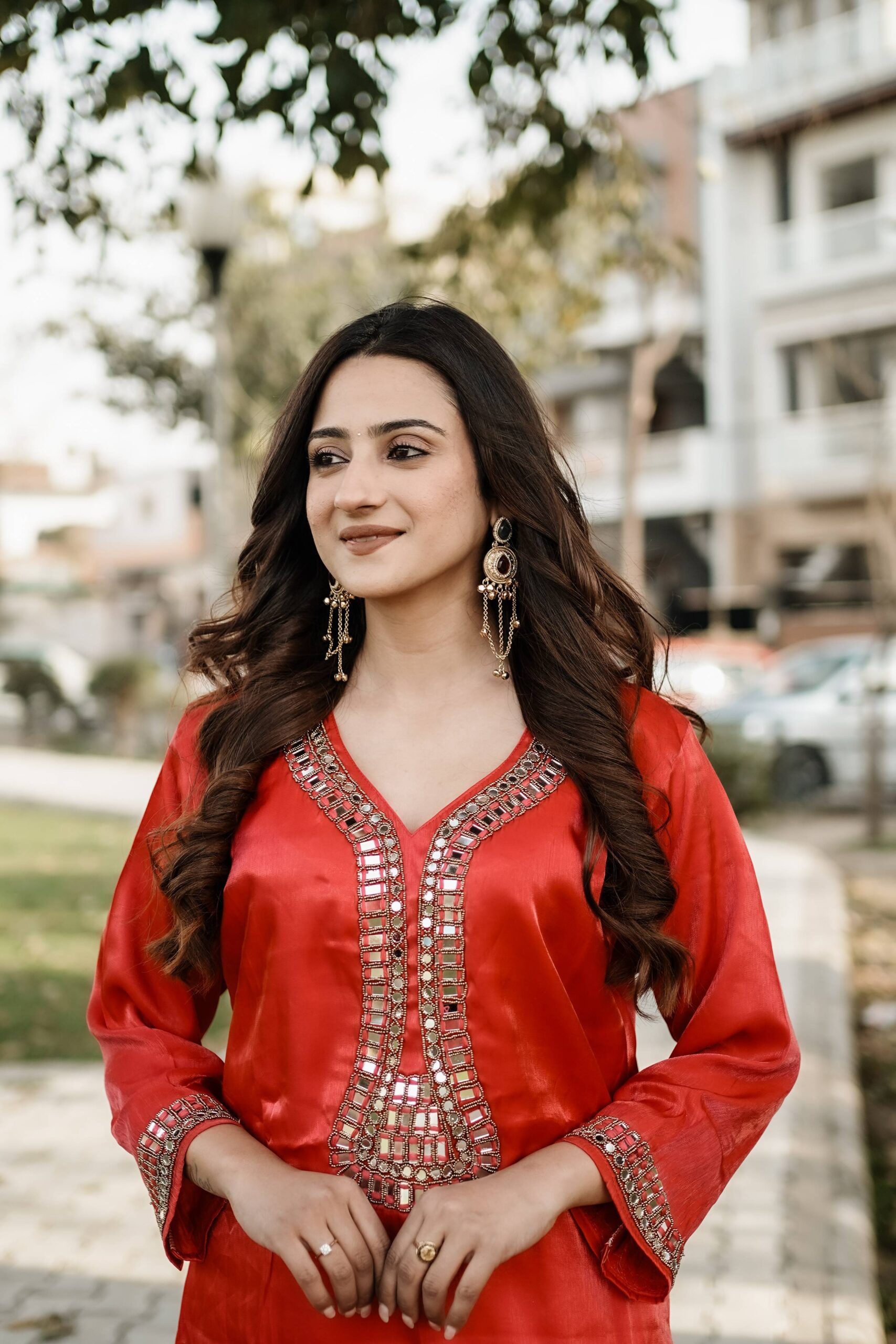Make a striking entrance with Rani Aura, a vibrant red festive kurta set designed for women who love timeless elegance with bold charm. Crafted in a rich, regal red hue, this ensemble features intricate mirror work and detailed embellishments along the neckline, sleeves, and hemline — creating a luminous festive appeal.