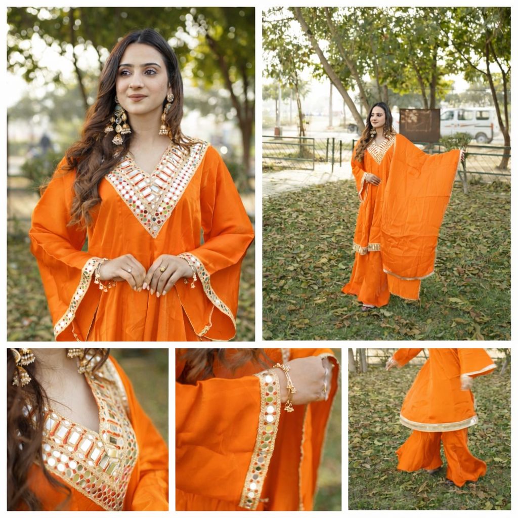 Make a statement this festive season with Rosé Meher, a vibrant and graceful kurta set designed to turn heads. Crafted in a rich pink hue (also available in orange), this ensemble features intricate mirror work detailing along the neckline and sleeve borders, adding the perfect festive sparkle.