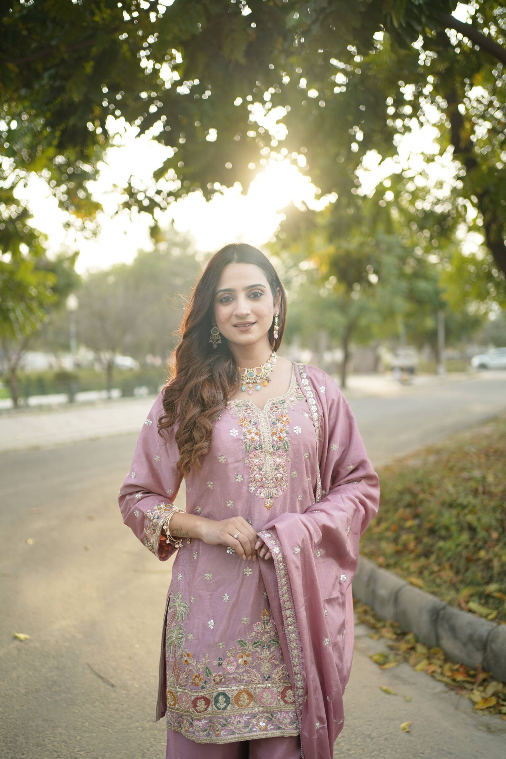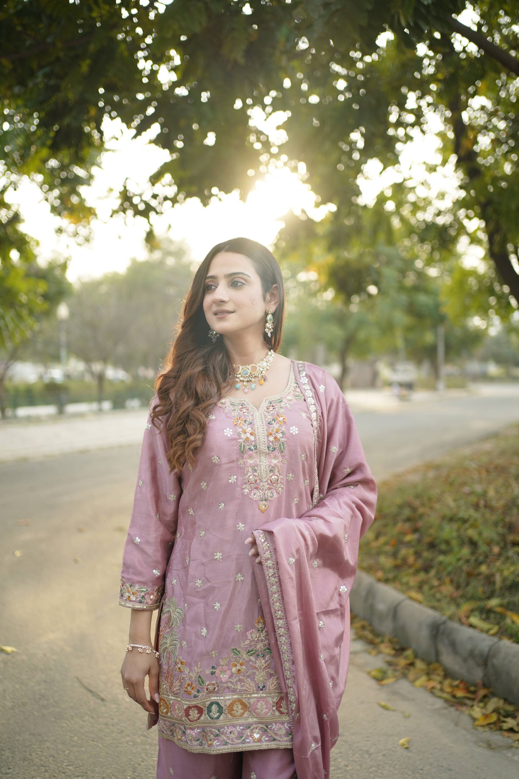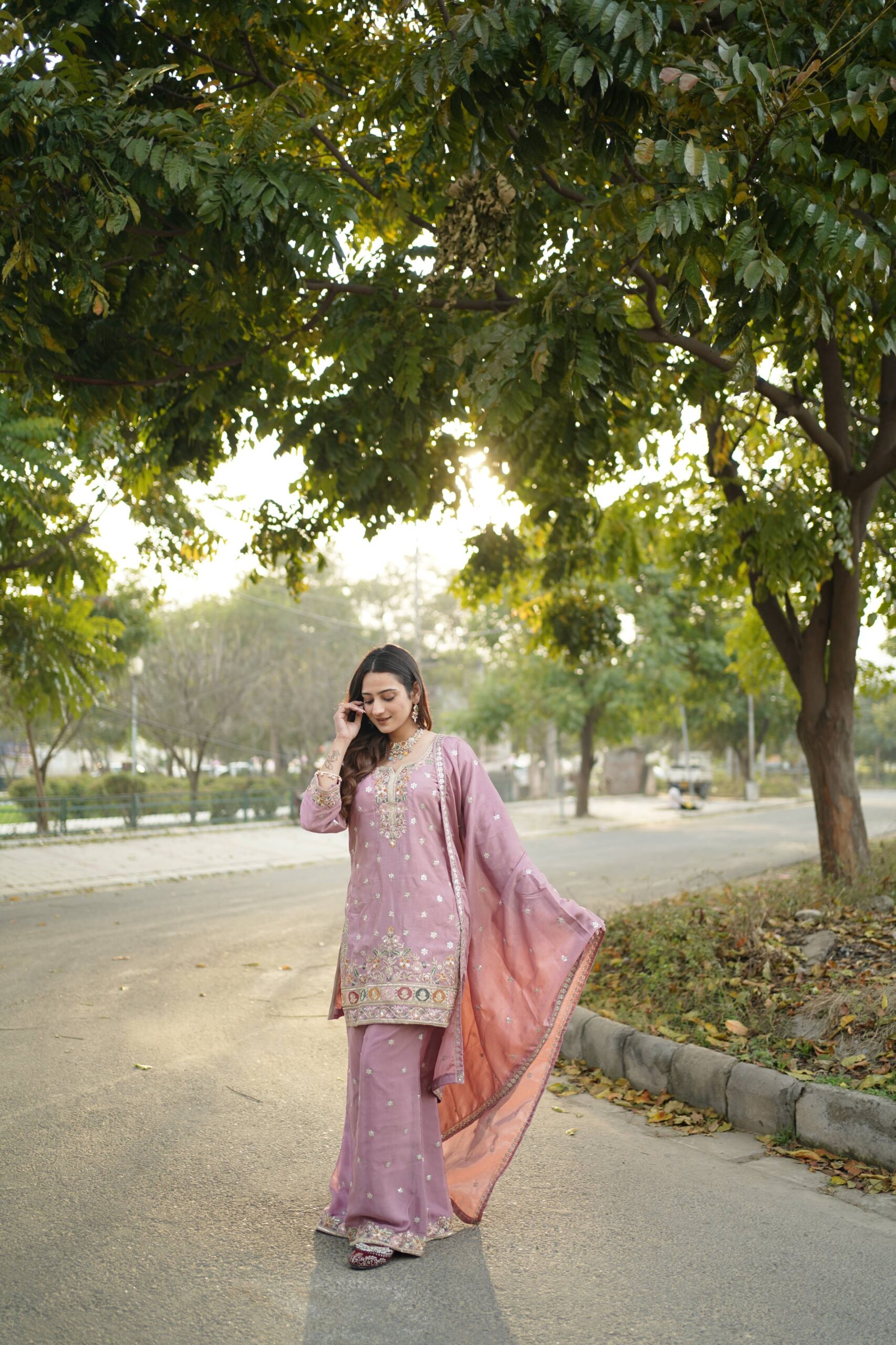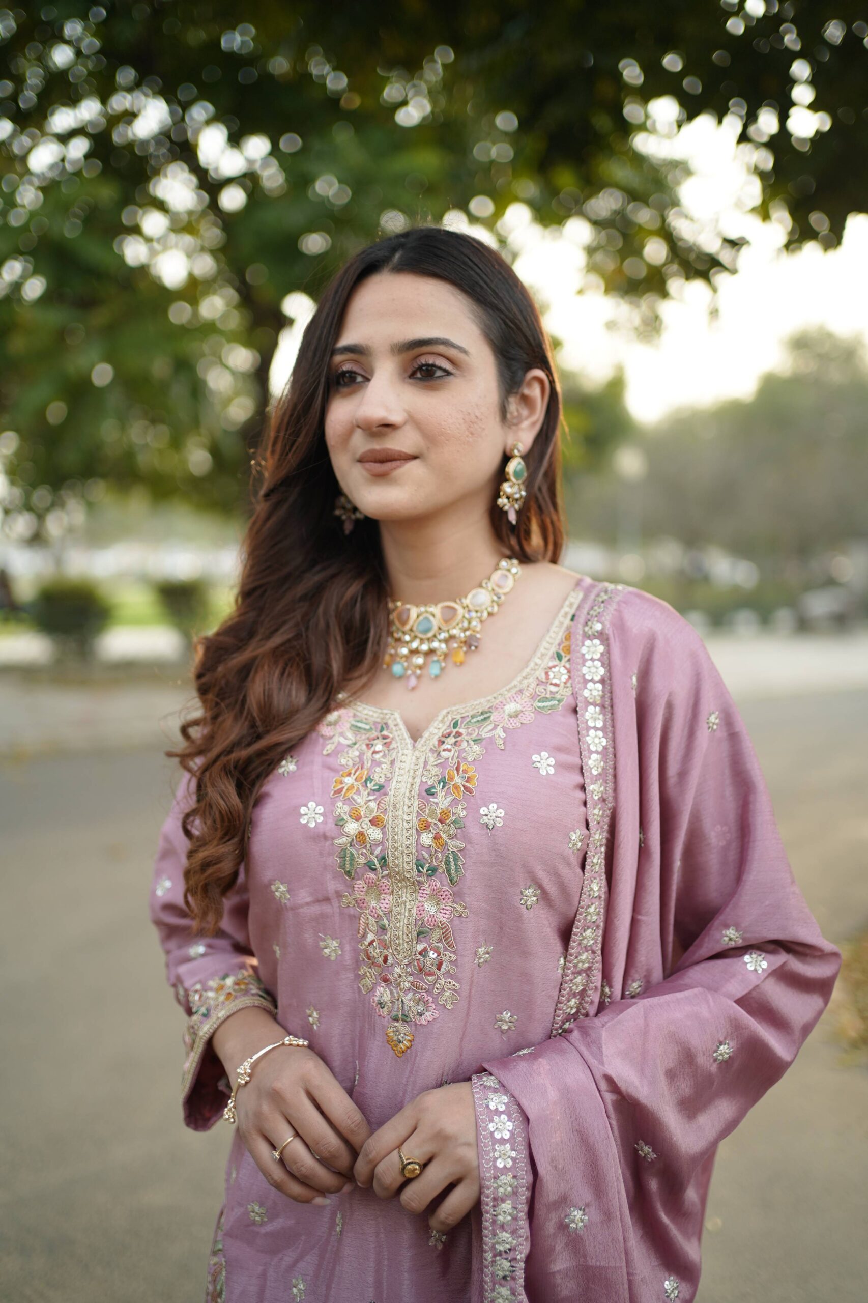Step into elegance with Shehzaadi, a beautifully crafted festive kurta set designed for women who love delicate detailing and timeless sophistication. Rendered in a soft pastel mauve hue, this ensemble features intricate multicolor floral embroidery along the neckline and hemline, creating a refined yet festive appeal.