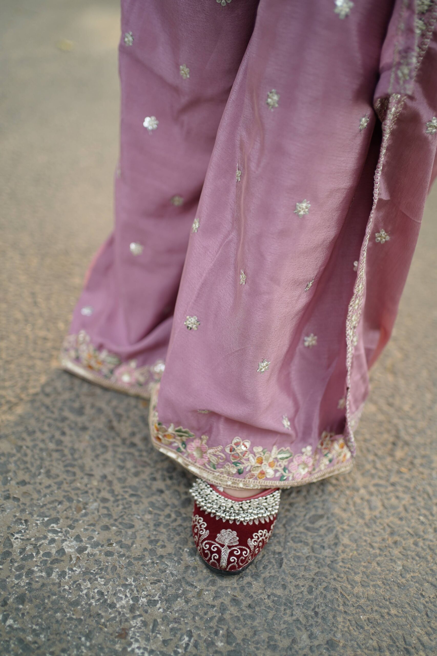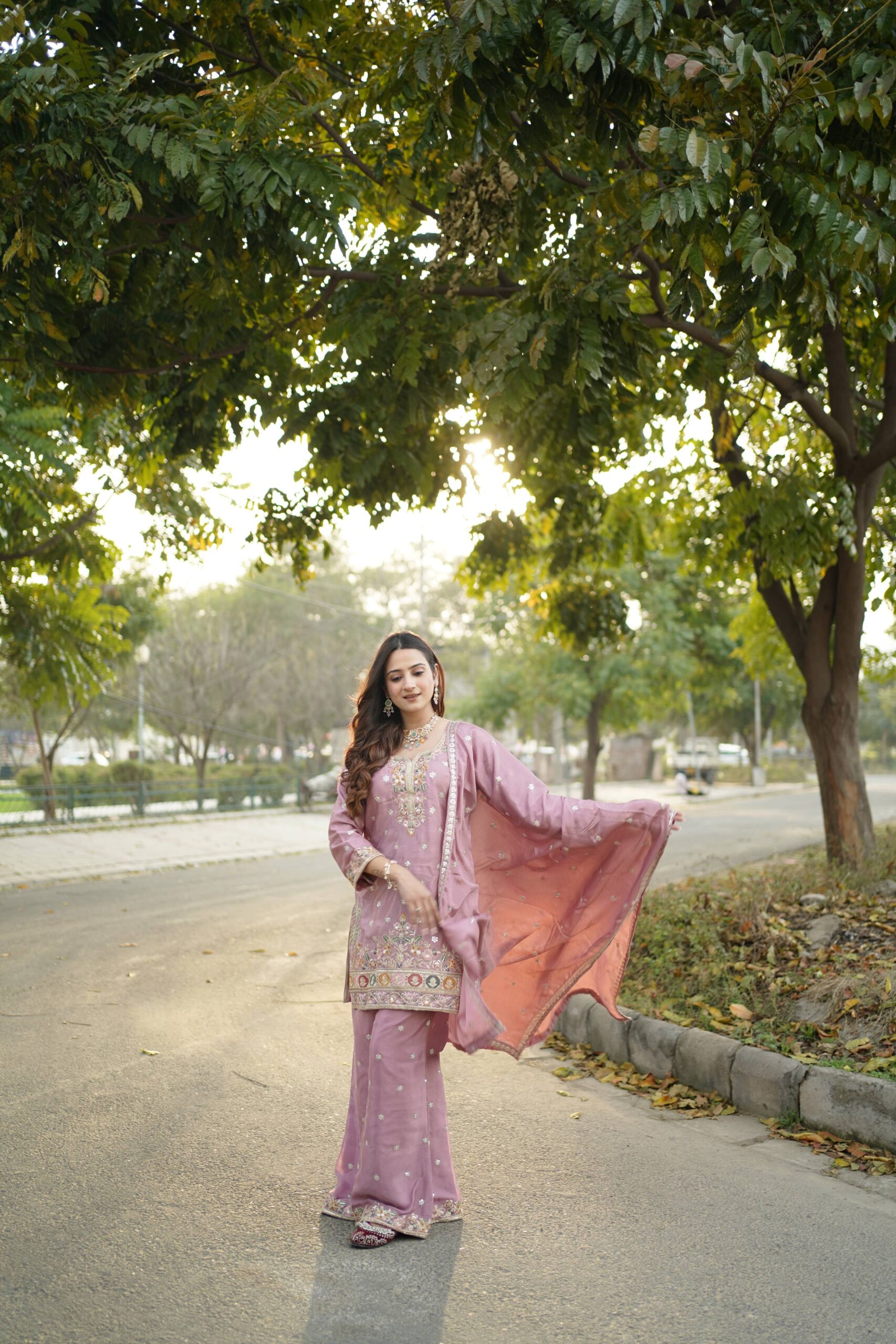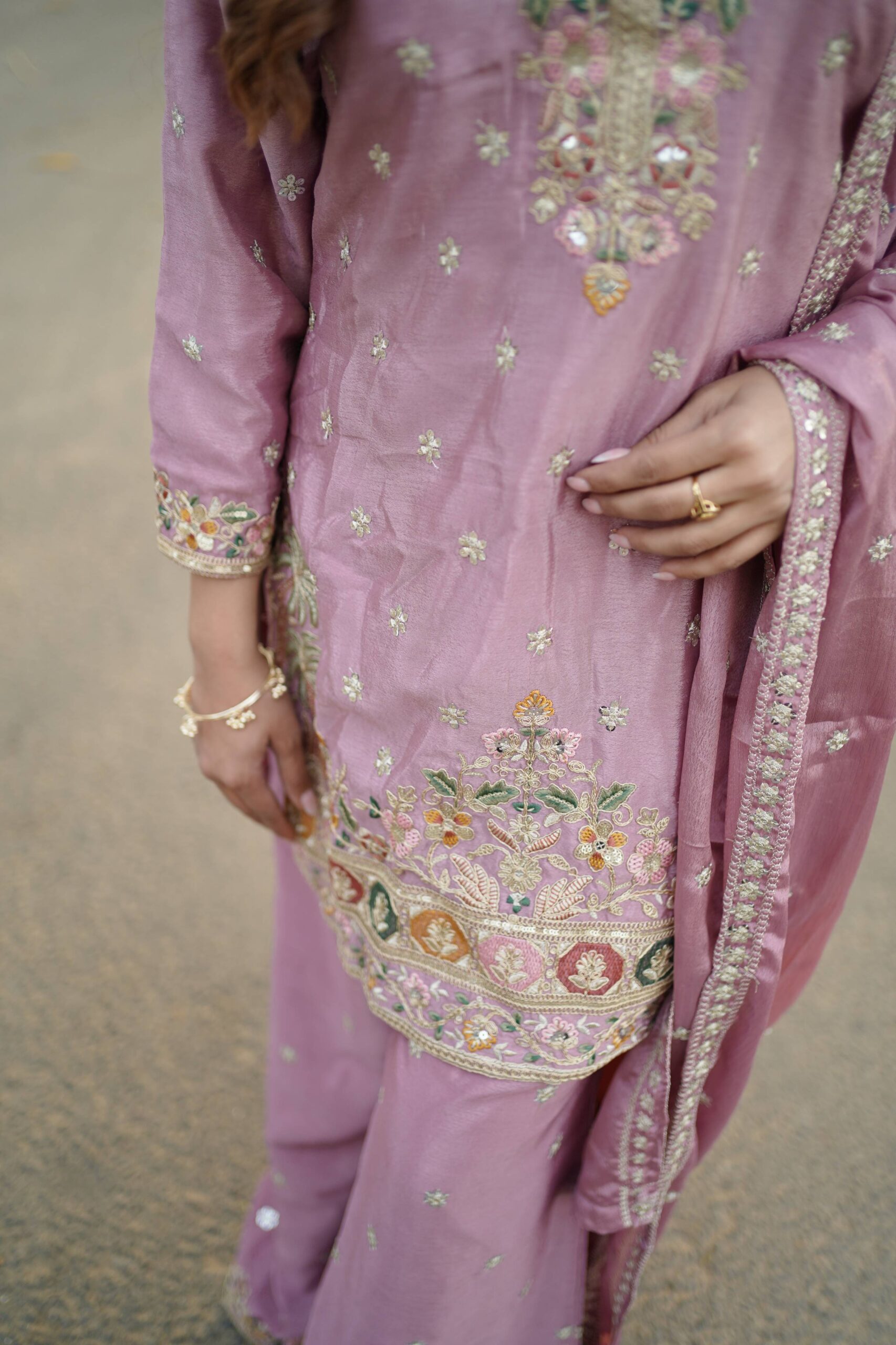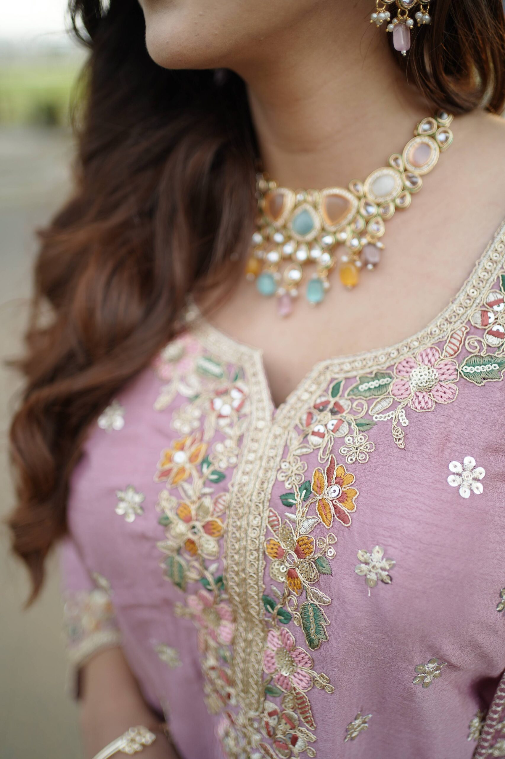Step into elegance with Shehzaadi, a beautifully crafted festive kurta set designed for women who love delicate detailing and timeless sophistication. Rendered in a soft pastel mauve hue, this ensemble features intricate multicolor floral embroidery along the neckline and hemline, creating a refined yet festive appeal.