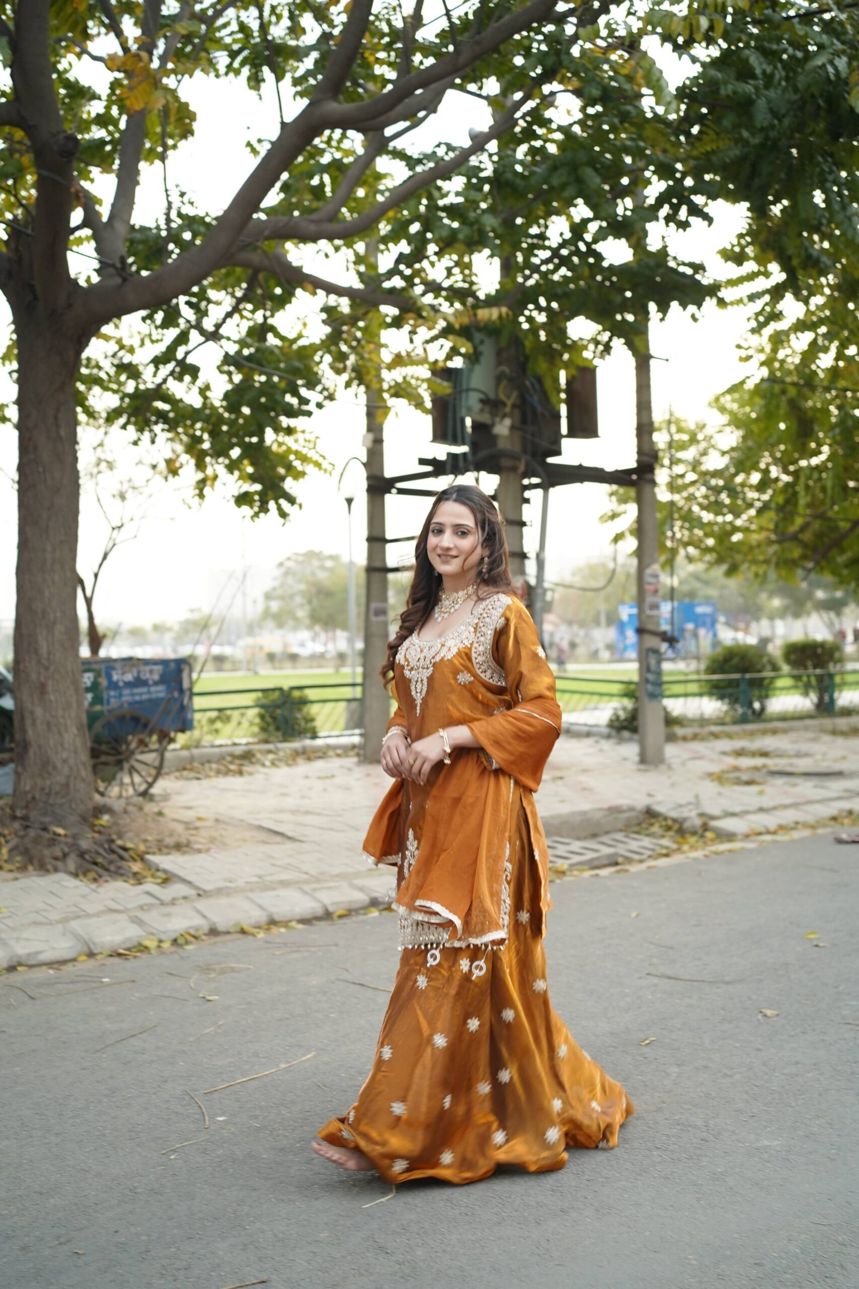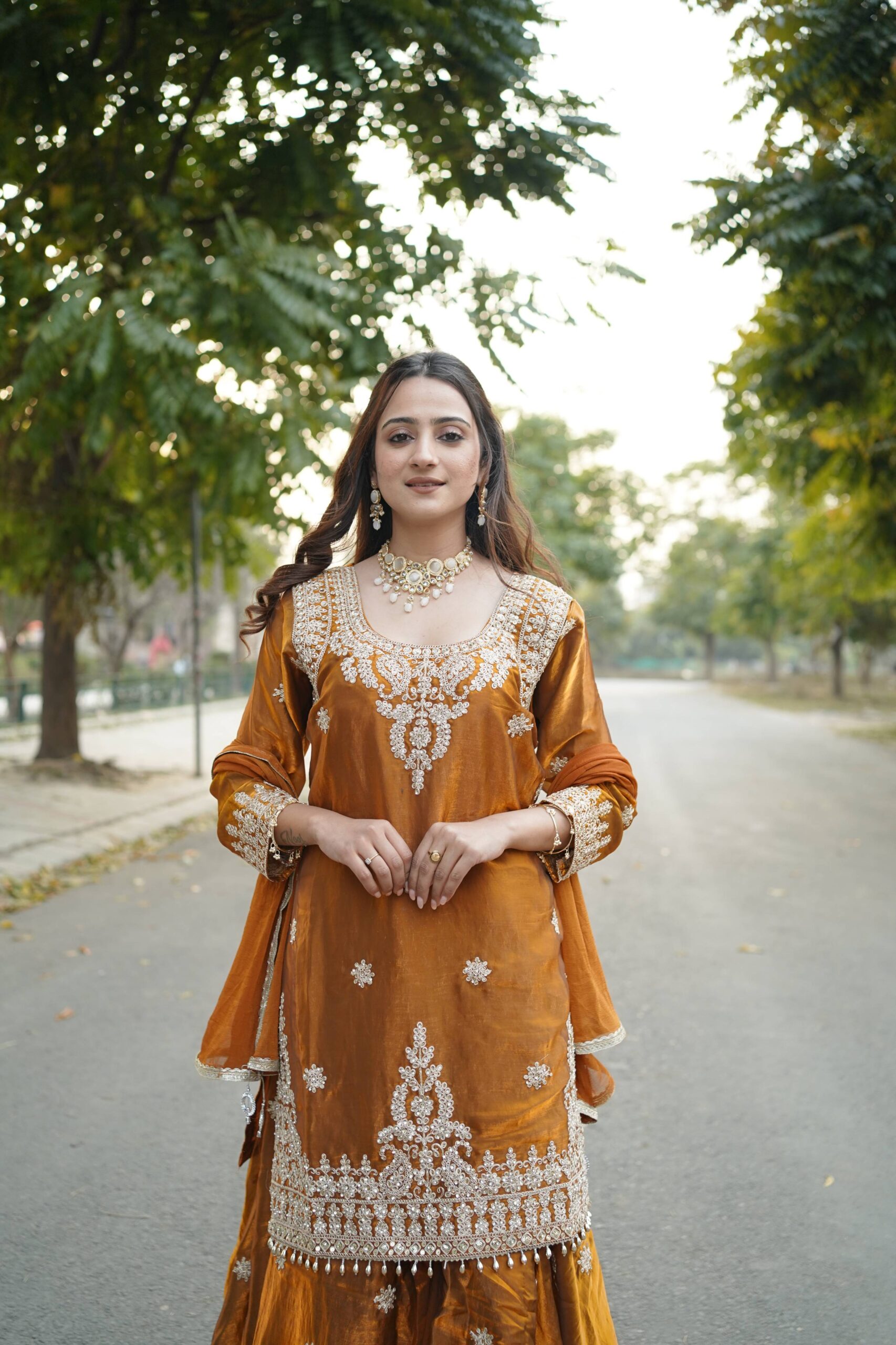 Make a grand festive statement with Surkh Saanjh, a luxurious kurta set designed for women who love bold elegance and intricate craftsmanship. Rendered in a rich burnt-orange hue, this ensemble features exquisite embroidery across the neckline, sleeves, and hemline — creating a beautifully detailed and festive-ready look.