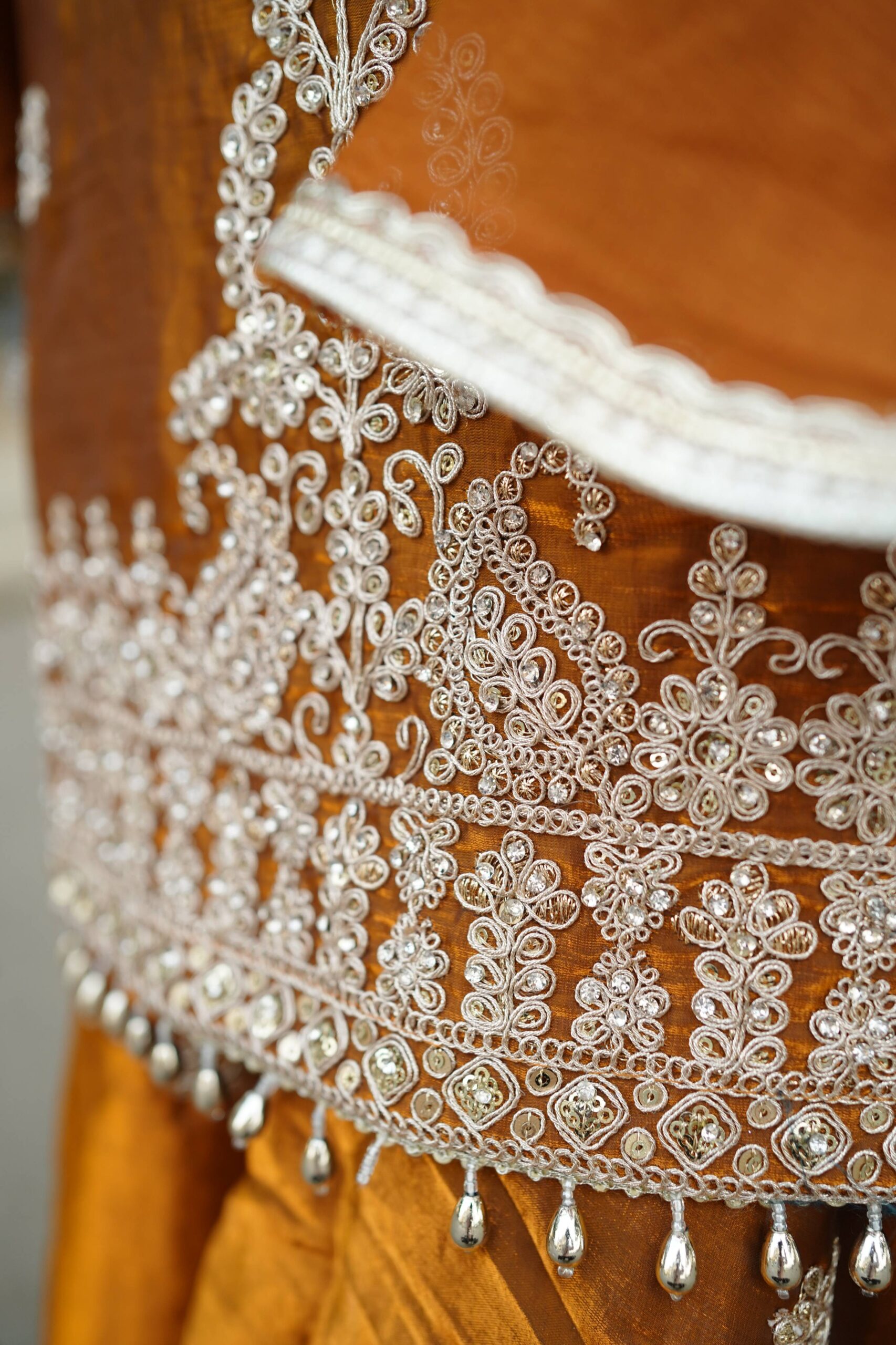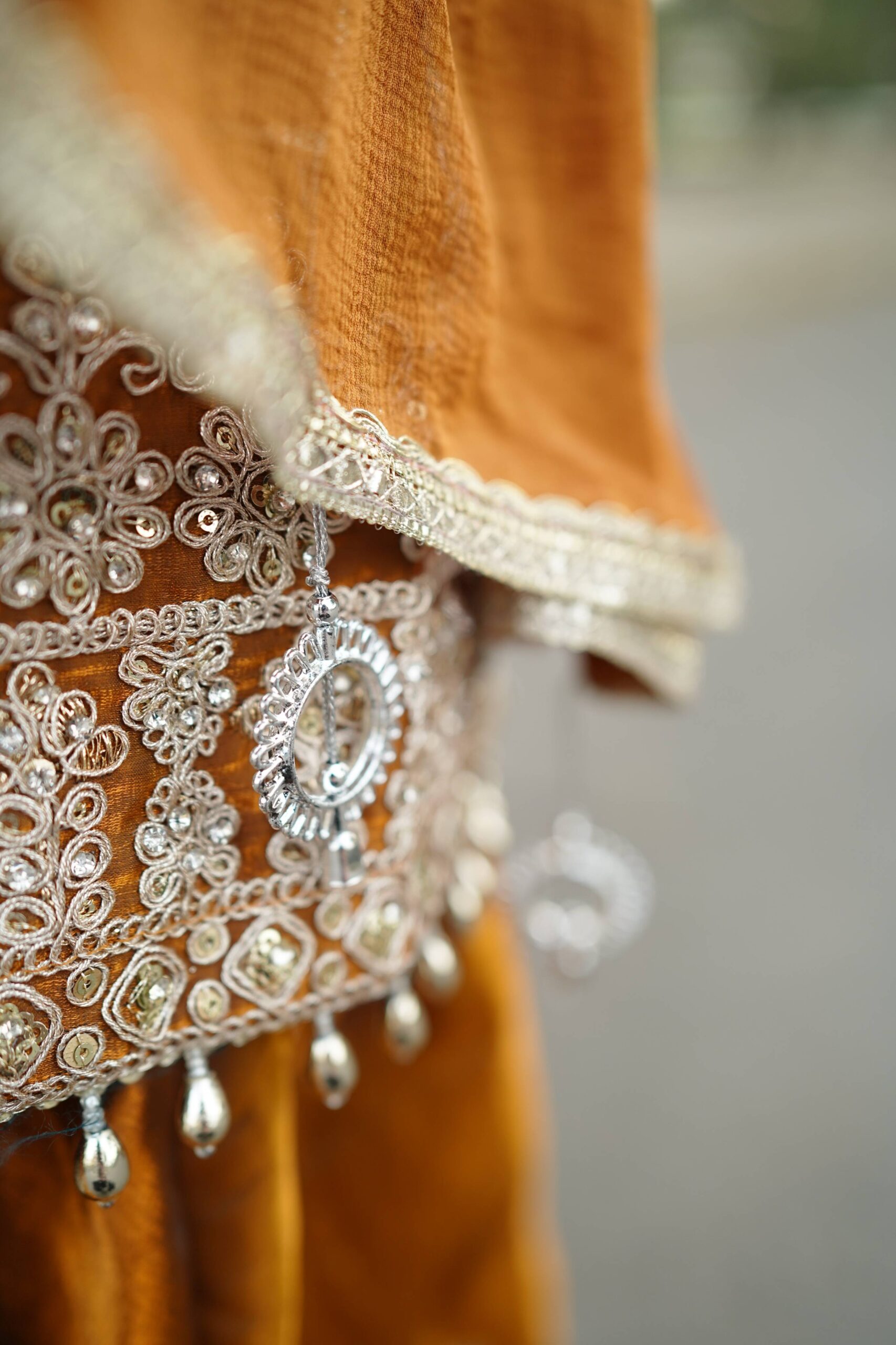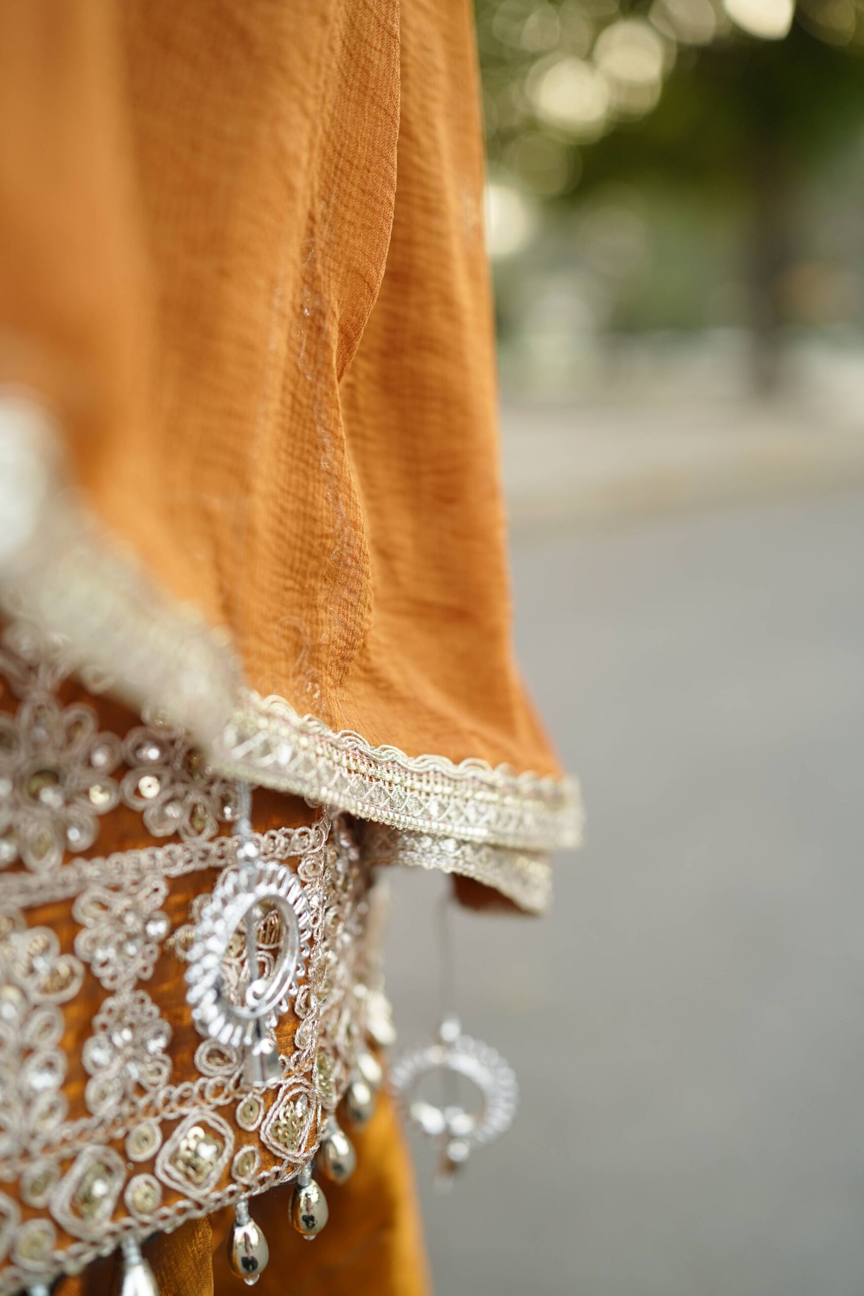 Regal and statement-worthy, Surkh Saanjh is a rich burnt-orange embroidered kurta set featuring intricate neckline detailing, embellished sleeves, coordinated bottoms, and a graceful dupatta. Perfect for weddings, festive celebrations, and grand occasions.