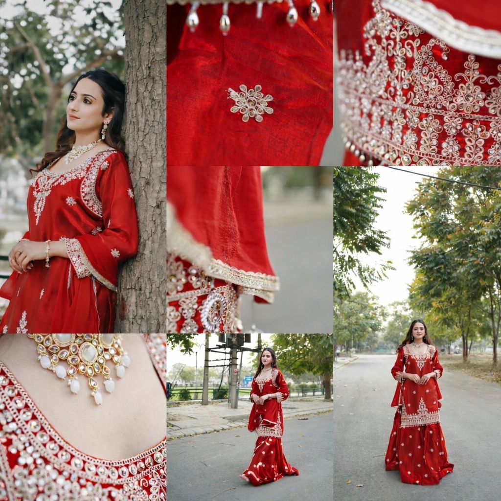 Perfect for wedding functions, festive evenings, engagement ceremonies, and celebratory occasions, Surkh Saanjh blends traditional artistry with contemporary grace — ensuring you stand out effortlessly.